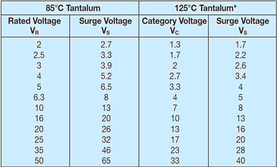 鉭電容在不同溫度下浪涌電壓的值是不一樣的,在85度及以下溫度時,分類電壓VC等于額定電壓VR,浪涌電壓VS等于額度電壓VR的1.3倍;在85到125度時,分類電壓VC等于額定電壓VR的0.66倍,浪涌電壓VS等于分類VC的1.3倍。具體如下圖所示: