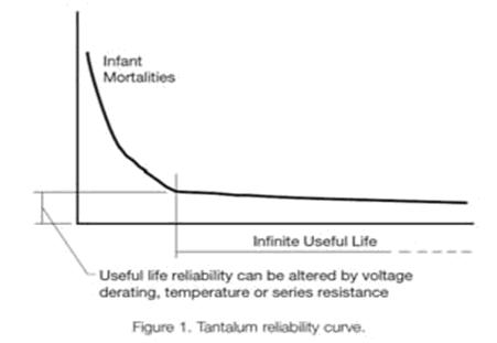 鉭電容介質鉭氧化物基本上沒有淘汰機制,某些情況下的磨損有自我修復能力(有限的自我修復能力),然而,在操作中經常會有隨機的故障的發生。鉭電容的故障率與工作時間有非常大的關系,將隨時間的縮短而減少。