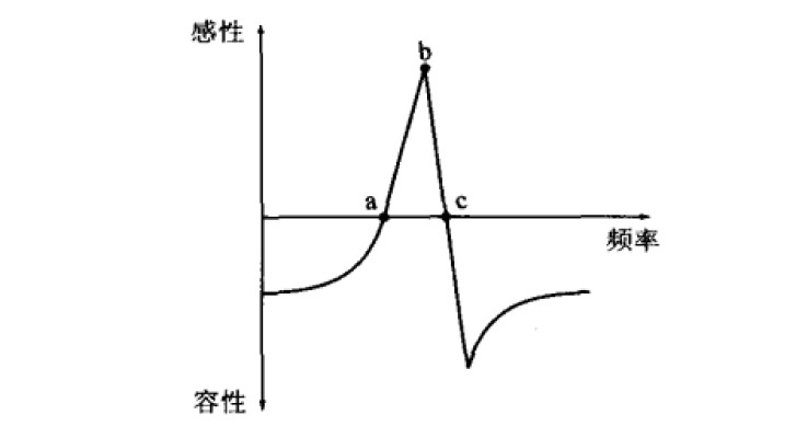如果在電氣方面觀察晶體振子,當頻率比諧振點低很多、或者是高很多時,晶體振子把晶體當做電介質,只能在電容器中看到。在諧振點附近的頻率中,進行特異的動作。隨著頻率的增加,電容器(容性)從a點附近開始進行線圈(感性)動作,在b點達到峰值。以后馬上失去感性,在高于c點的頻率中,再次恢復到作為電容器的性質。