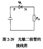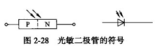 光敏二極管的外形與普通二極管相似。裝在透明的玻璃外殼內(nèi),PN結(jié)殼裝在管子頂部,易于接收光線照射。鍺光敏二極管A、B、C、D四類,硅光敏二極管有2CU1A~D和2DU1~4系列。光敏二極管的符號如圖2-28所示。光敏二極管的接線如圖2-29所示。