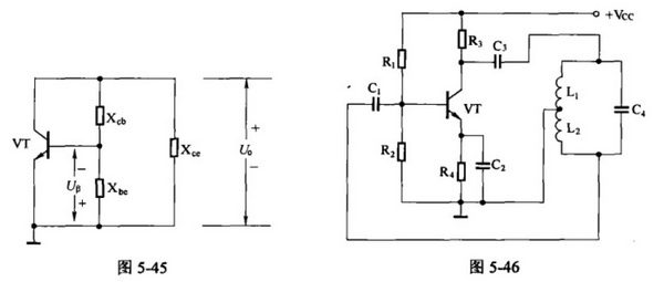 三點式振蕩器是指晶體管的三個電極直接與振蕩回路的三個端點相連接而構成的振動器,如圖5-45所示。3個電抗中,必有有兩個相同性質的電抗(同是電感或者電容),而另一個必須是與前兩者相反性質的電抗,才能滿足振蕩的相應條件。三點式振蕩器有很多種形式,較常用的有電感三點式振蕩器、電容三點式振蕩器、改進型電容三點式振蕩器等。