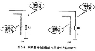 圖3-8所示是判斷整流電路輸出電壓極性方法示意圖。圖3-8所示電路中,整流后的電流是從上而下地流過負載電阻R1,由此可知R1上的電壓是上正下負,而R1的下端接地線,這是參考端,其電壓為0V,所以R1上的電壓是正極性的,因此這一整流電路輸出正極性。圖3-8電路中,電流從下而上流過負載電阻R1,所以R1上的電壓是負極性的。