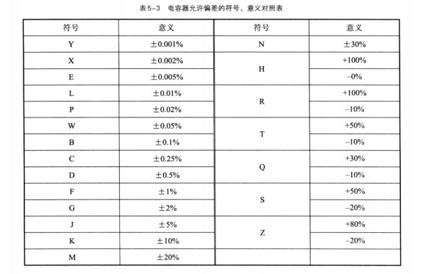 電容器允許偏差的符號(hào)、意義對(duì)照表如表5-3所示。