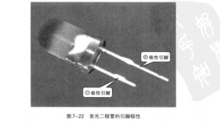 通常情況下,發(fā)光二極管可以通過引腳的長短來判別極性。如圖7-22所示,引腳相對較長的一端為發(fā)光二極管的A極(正極),較短的一端為二極管的K極(負(fù)極)。