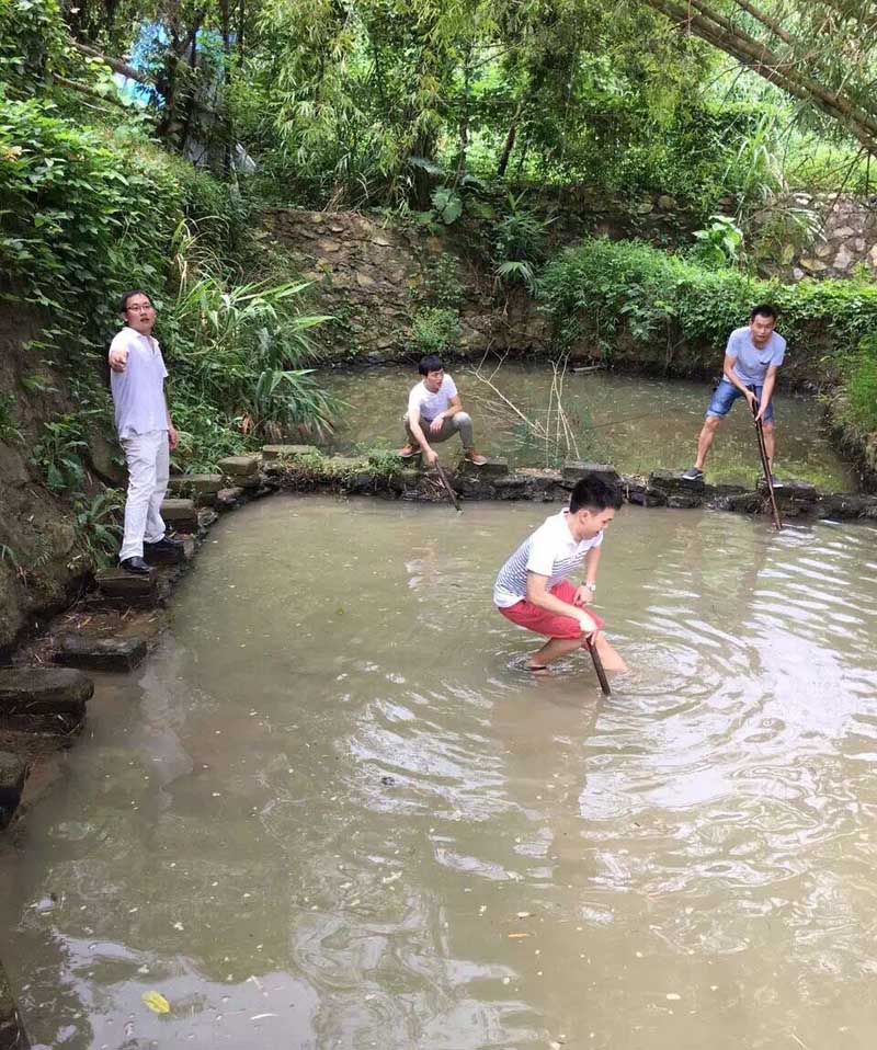 下魚塘準備抓魚中